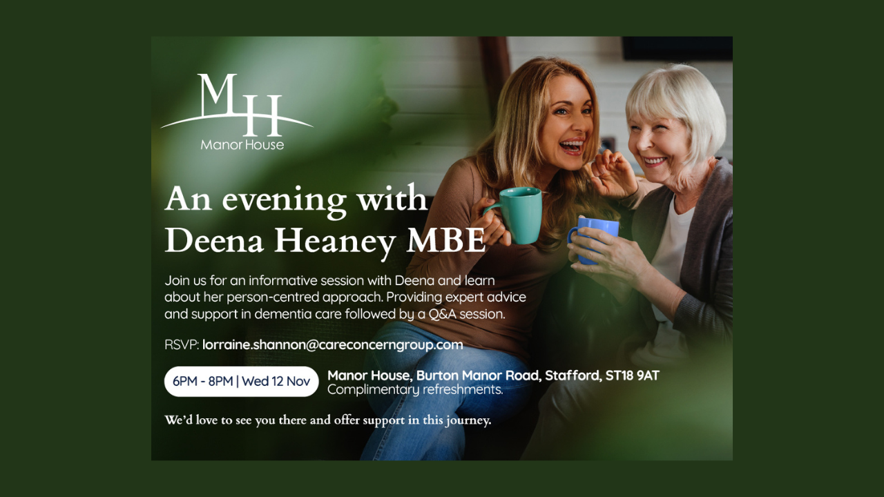 At Manor House Care Home in Stafford, we understand that choosing the right care for a loved one is one of the most important decisions a family can make. That’s why we’re opening our doors for a special evening with Deena Heaney MBE, a recognised expert in dementia care and a passionate advocate for person-centred support.